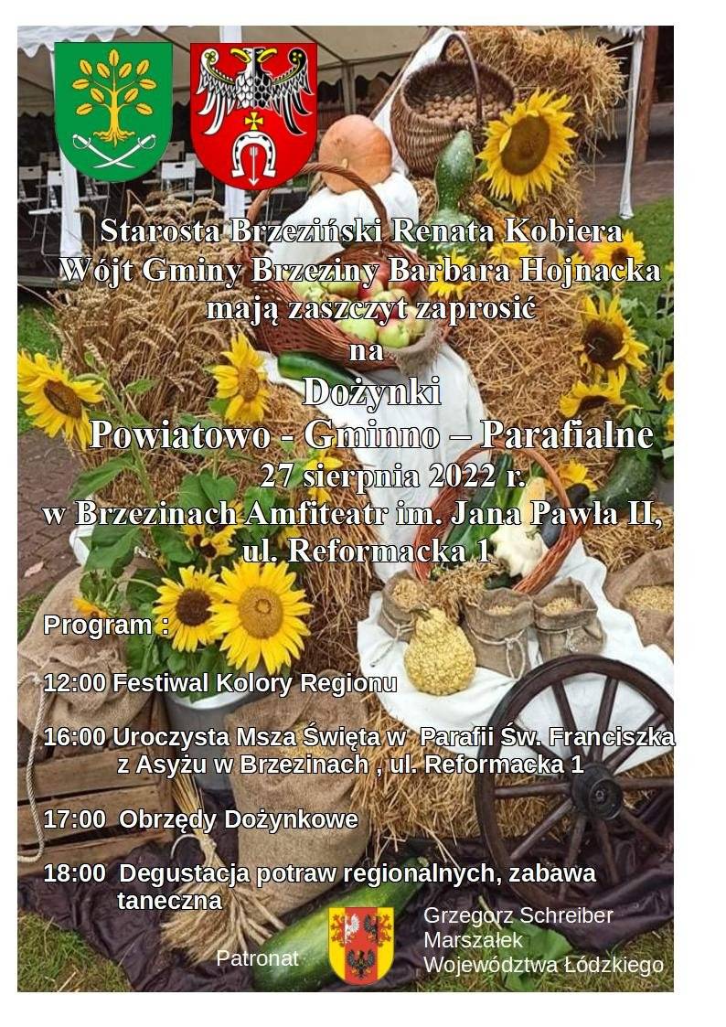 Starosta Brzeziński Renata Kobiera i Wójt Gminy Brzeziny Barbara Hojnacka zapraszają na Dożynki Powiatowo-Gminno-Parafialne.