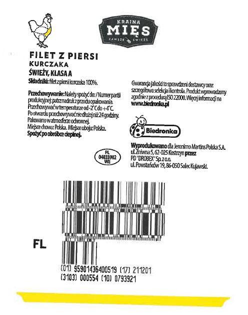 Producent: Przedsiębiorstwo Drobiarskie DROBEX Sp. z o.o., ul. Powstańców 19, 86-050 Solec Kujawski, weterynaryjny numer identyfikacyjny 04033902