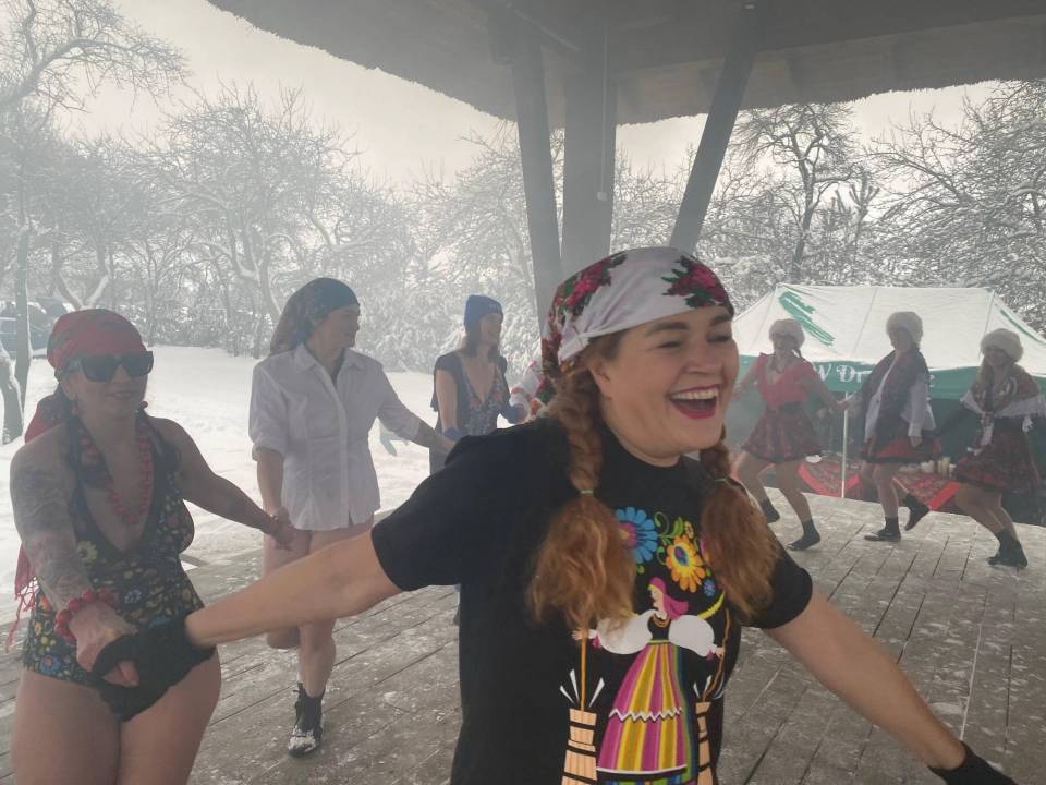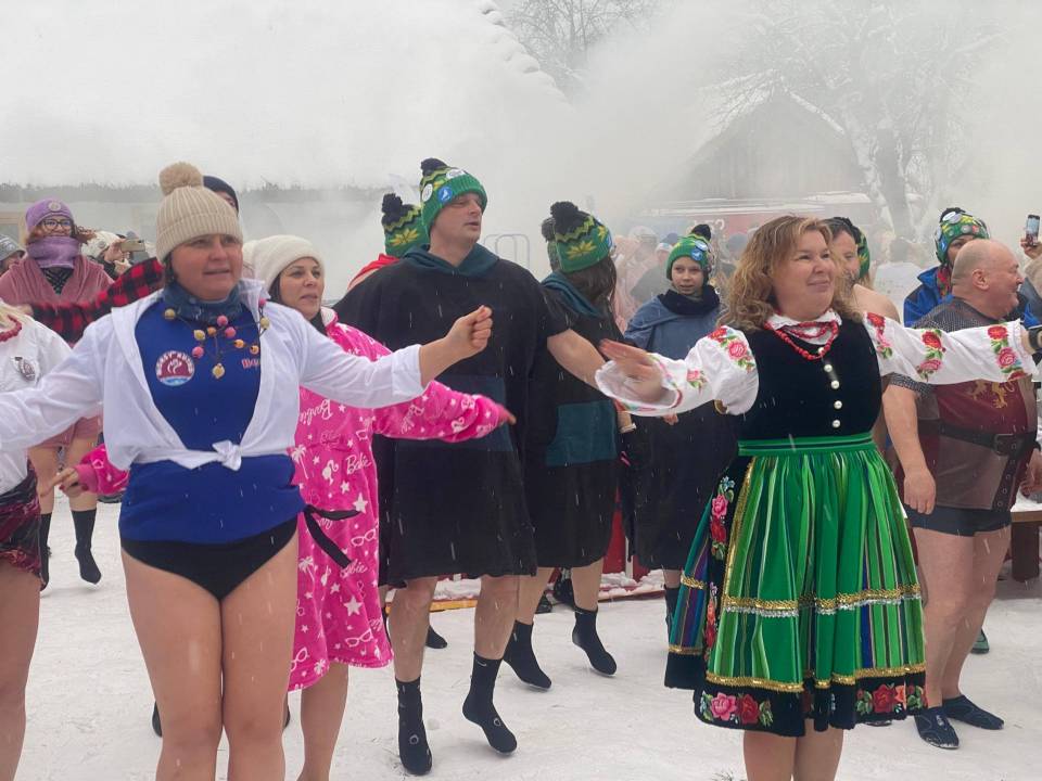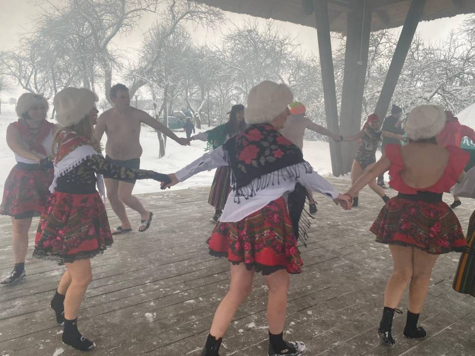 Lodowe kąpiele przeplatały się ze wspólnymi śpiewami i zabawą przy muzyce ludowej, która idealnie wpisała się w klimat miejsca. Dźwięki regionalnych melodii niosły się po skansenie, tworząc niepowtarzalną atmosferę i przypominając, że folklor nie jest reliktem przeszłości, lecz żywą, radosną częścią lokalnej tożsamości.