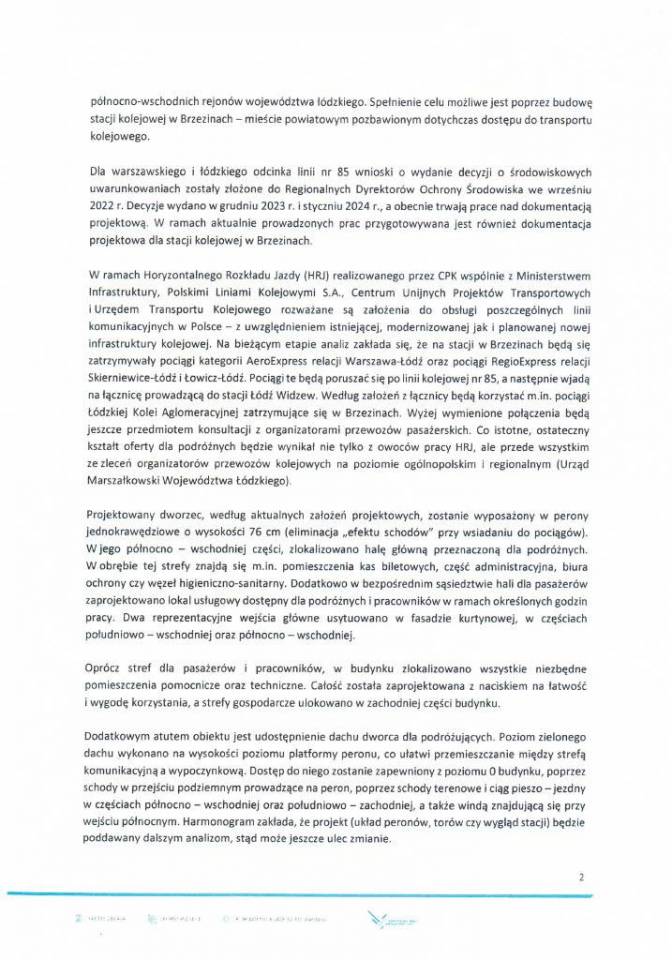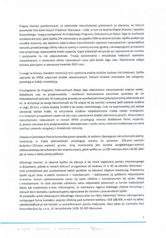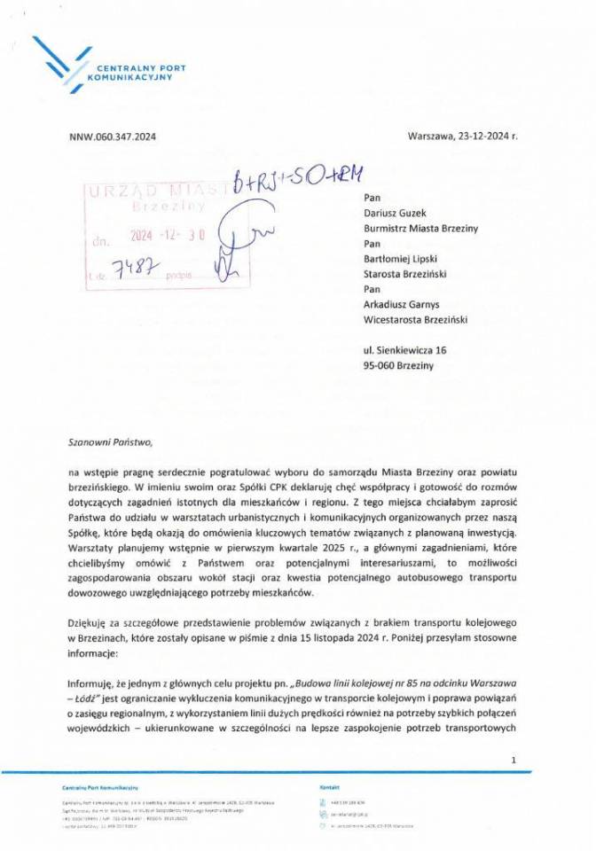 Filip Czernicki, Prezes Zarządu CPK przesłał list do władz miasta i powiatu brzezińskiego, w którym przekazał ważne wiadomości dotyczące budowy linii kolejowej na odcinku Łódź – Warszawa. Podkreśla w nim, że realizacja inwestycji w postaci linii dużych prędkości poprawi zaspokojenie potrzeb transportowych północno-wschodnich rejonów woj. łódzkiego.