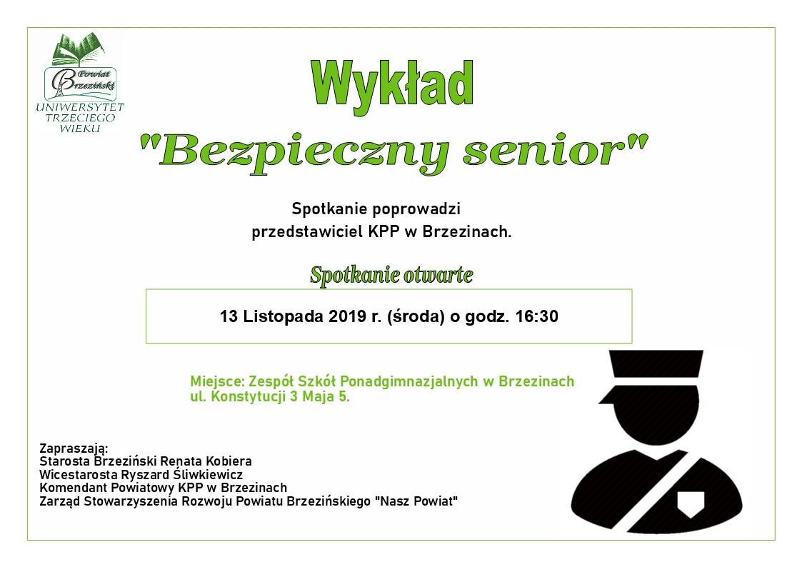 Zapraszamy na wykład "Bezpieczny senior", który odbędzie się 13 listopada (środa) o godzinie 16:30 w Zespole Szkół Ponadgimnazjalnych w Brzezinach, ul. Konstytucji 3 Maja 5.