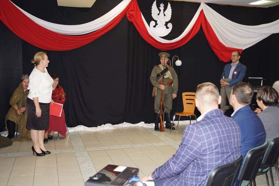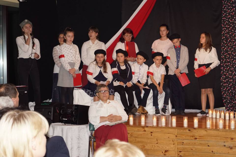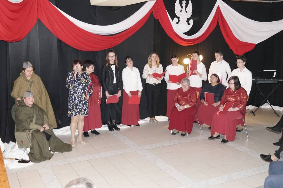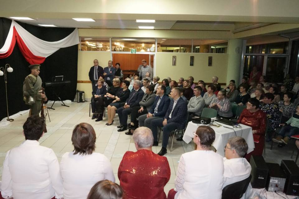 Wszyscy spotkali się w ten wieczór, aby razem, ze społecznością Mieszkanek DPS w Dąbrowie, wrócić pamięcią do 11 listopada… Święta Niepodległości. Inspiracją do zadumy, refleksji był spektakl przygotowany przez Panią Jolantę Łyszkowicz, a wykonany przez mieszkanki Domu oraz zaproszonych dzieci i młodzieży „Pamięć od śmierci uchronić…" Spektakl zrealizowany w oparciu o poezję wojenną, poezję współczesną, rozważania i słowa Św. Jana Pawła II, muzykę Chopina, utwory muzyczne z repertuaru Lecha Makowieckiego, Huberta Smolińskiego, z cyklu "Panny Wyklęte"… opowiadał o tym co znaczy: „pytać o Ojczyznę…, walczyć o wolność…,kochać kraj rodzinny…, mieć nadzieję…, z odwagą mówić o tym, co boli, czego żal, co kochasz, co tracisz, co myślisz..." Wieczór zakończył pokaz mundurów , oraz refleksja zaproszonych miłośników historii „…w carskim wojsku walczyłem, ale tylko dla Polski".